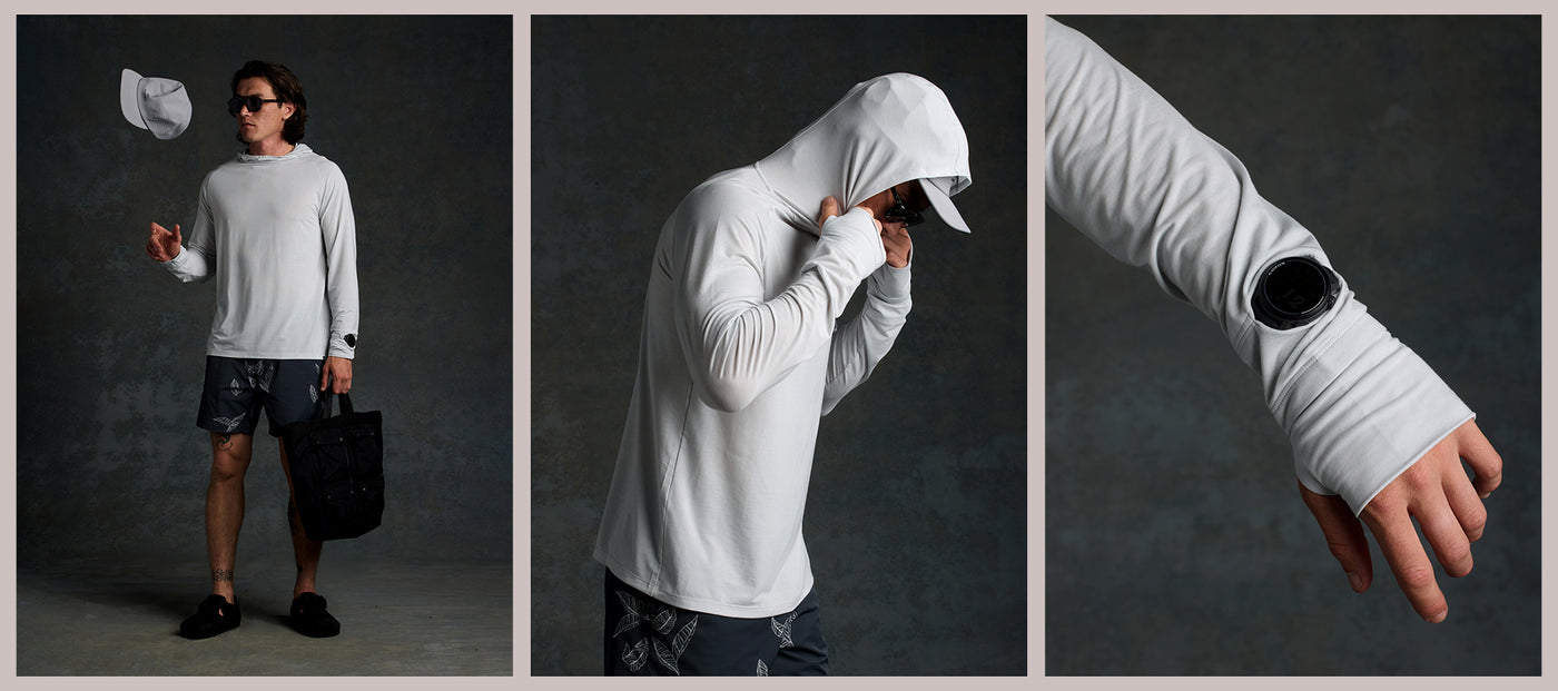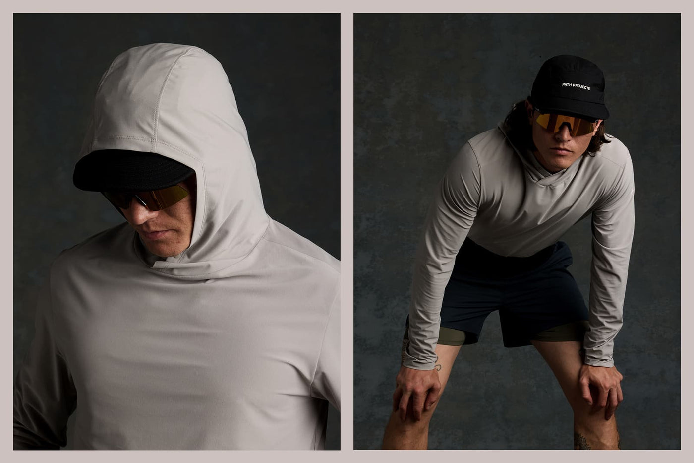 Wadi Hoodie in Dove, Graves PX 5” Shorts in Navy, Tahoe CL 8” Base Liner in Muted Green, Saguaro Hat in Black (Coming Soon)